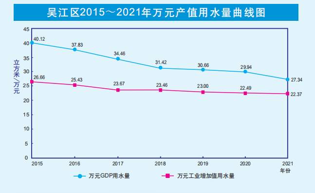 2021年,吳江區(qū)萬元地區(qū)生產(chǎn)總值用水量為27.34立方米,按可比價(jià)計(jì)算,較2020年下降了6.04%;萬元工業(yè)增加值用水量為22.37立方米,按可比價(jià)計(jì)算,較2020年上升了3.67%。