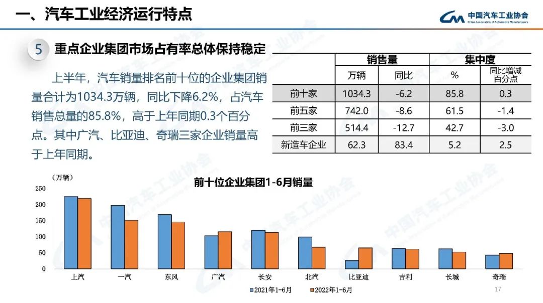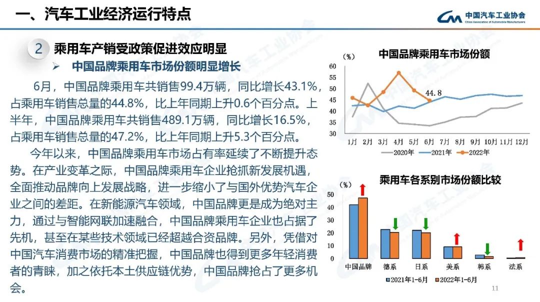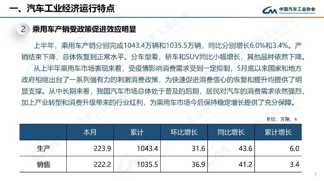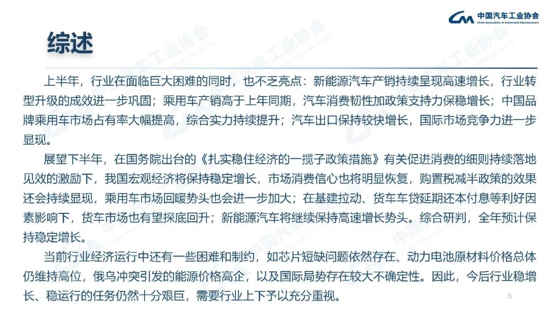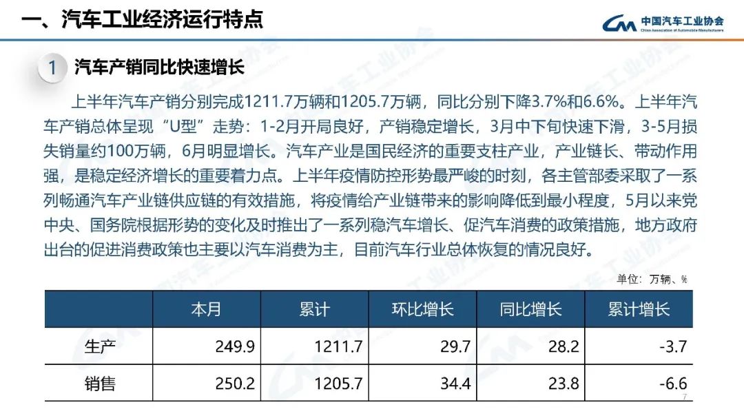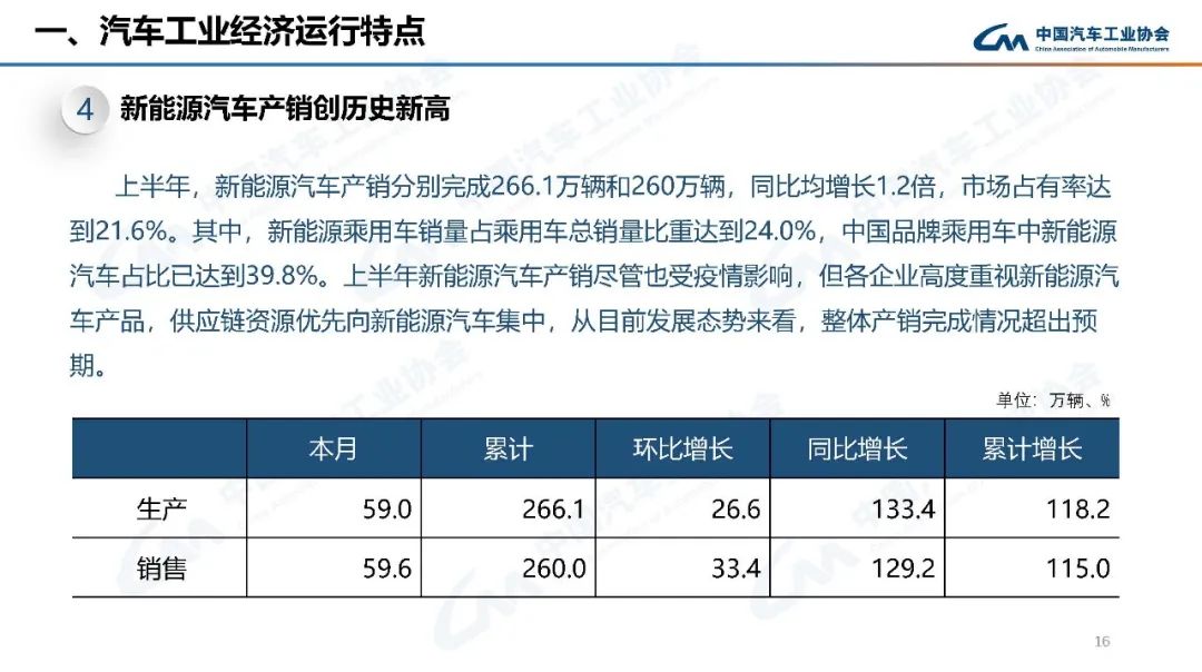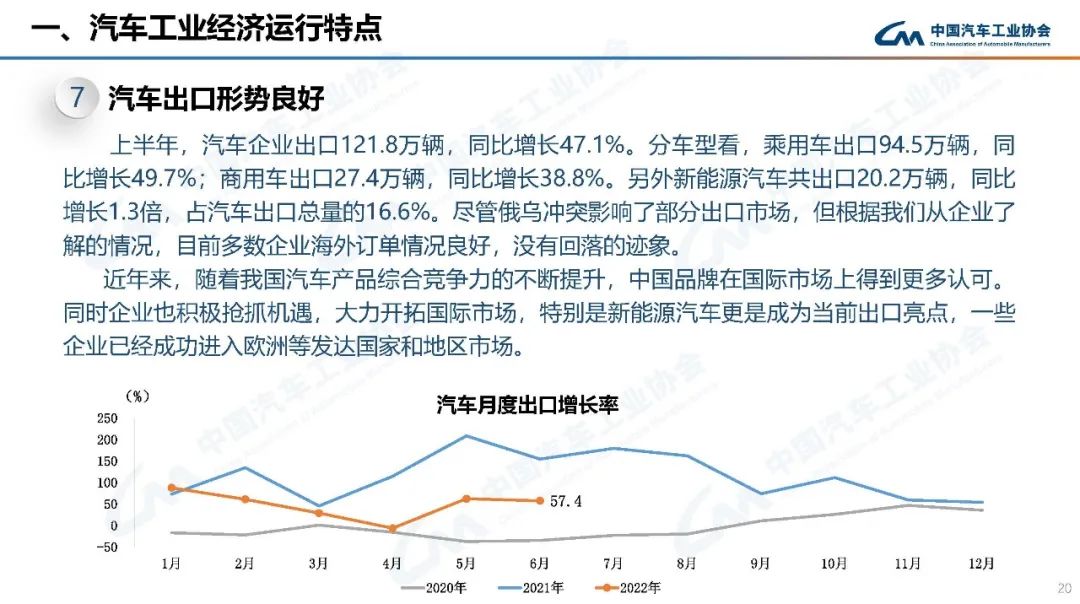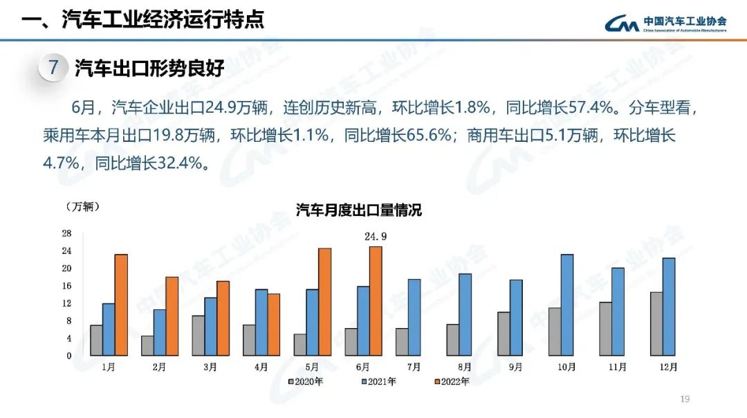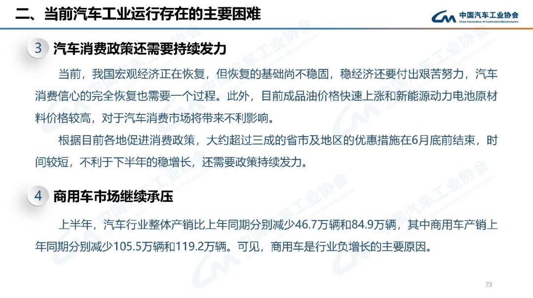 上半年,行業(yè)在面臨巨大困難的同時(shí),也不乏亮點(diǎn):新能源汽車產(chǎn)銷持續(xù)呈現(xiàn)高速增長(zhǎng),行業(yè)轉(zhuǎn)型升級(jí)的成效進(jìn)一步鞏固;乘用車產(chǎn)銷高于上年同期,汽車消費(fèi)韌性加政策支持力保穩(wěn)增長(zhǎng);中國(guó)品牌乘用車市場(chǎng)占有率大幅提高,綜合實(shí)力持續(xù)提升;汽車出口保持較快增長(zhǎng),國(guó)際市場(chǎng)競(jìng)爭(zhēng)力進(jìn)一步顯現(xiàn)。