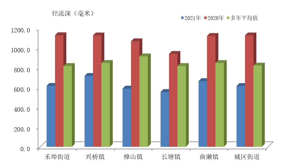 全區(qū)地表水資源量2.7599億立方米,比多年平均值偏少25.3%。按行政分區(qū)統(tǒng)計,年徑流深以興橋鎮(zhèn)715.7毫米為最大,長塘鎮(zhèn)553.4毫米為最小;與上年比較均偏小,減幅最大的是禾埠街道、城區(qū)街道45.4%;與多年平均比較均偏小,減幅最大的是樟山鎮(zhèn)35.7%;見表2.2.1、圖2.2.1。工程資料_工程咨詢_十四五