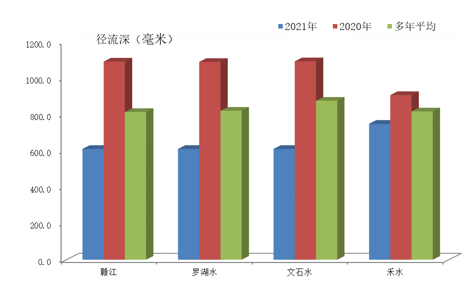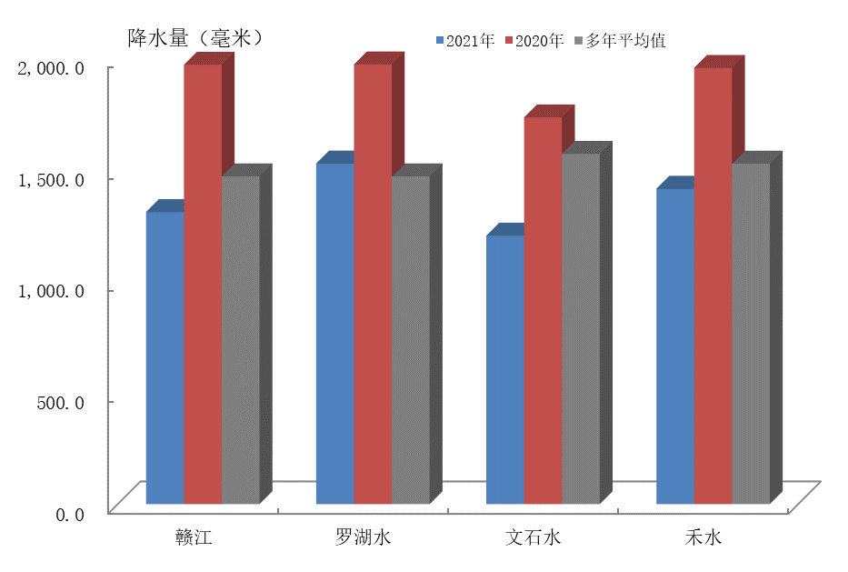 50平方千米以上河流年降水量分布:最大的是羅湖水1524.0毫米,其次是禾水1411.0毫米;最小的是文石水1201.5毫米;與上年比較贛江、禾水、羅湖水、文石水均偏小,與多年平均比較羅湖水偏大,其他均偏小,減幅最大的是文石水23.3%;見表2.1.4、圖2.1.3。(吉安市)2021年吉州區(qū)水資源公報