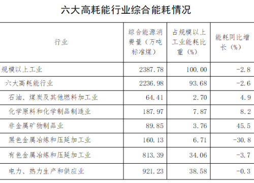(一)規(guī)模以上工業(yè)綜合能耗下降。上半年,全市規(guī)模以上工業(yè)綜合能源消費量2387.78萬噸標準煤,同比下降2.85%,降幅較1-5月份收窄0.79個百分點。規(guī)模以上工業(yè)煤炭消費量3093.58萬噸,同比增加57.09萬噸,增速為1.88%。