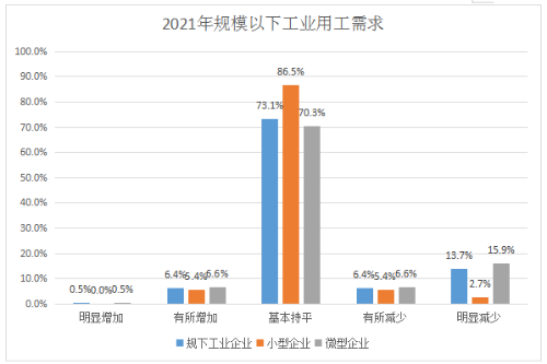 根據(jù)調(diào)查問卷顯示,80%企業(yè)全年用工需求增加或基本持平,0.5%的企業(yè)表示用工需求明顯增加;6.4%的企業(yè)表示用工需求有所增加;73.1%的企業(yè)表示用工需求基本持平;6.4%的企業(yè)表示用工需求有所減少;13.7%的企業(yè)表示用工需求明顯減少。