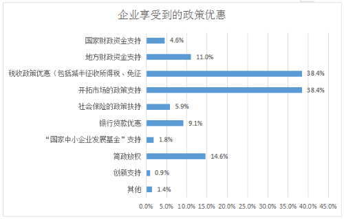 根據(jù)調(diào)查問卷顯示,314家規(guī)模以下抽樣調(diào)查工業(yè)企業(yè)中,有222家企業(yè)享受到一至多項(xiàng)優(yōu)惠政策,受惠面達(dá)70.7%。其中,38.4%的企業(yè)享受稅收政策優(yōu)惠,38.4%的企業(yè)享受開拓市場(chǎng)政策支持,14.6%的企業(yè)享受簡(jiǎn)政放權(quán)政策支持,還有部分企業(yè)享受社會(huì)保險(xiǎn)的政策扶持、銀行貸款優(yōu)惠、國(guó)家財(cái)政資金支持、“國(guó)家中小企業(yè)發(fā)展基金”支持、創(chuàng)新支持、地方財(cái)政政策支持等政策優(yōu)惠支持。隨著一系列扶持政策措施持續(xù)落實(shí),更多的企業(yè)享受到扶持政策的紅利,促進(jìn)企業(yè)生產(chǎn)經(jīng)營(yíng)持續(xù)平穩(wěn)向好發(fā)展。