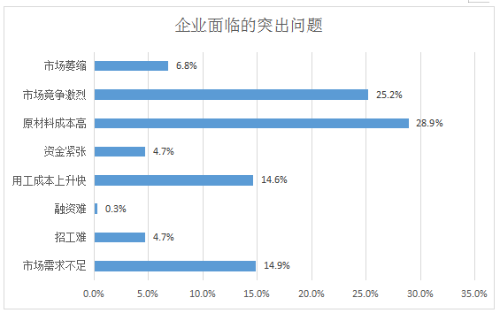今年以來,隨著國(guó)際大宗商品價(jià)格持續(xù)上漲,企業(yè)的原材料價(jià)格和工人的薪酬都有不同程度上漲。28.9%的企業(yè)認(rèn)為原材料成本高、14.6%的企業(yè)認(rèn)為用工成本上升快是本報(bào)告期面臨的突出問題。據(jù)抽樣調(diào)查測(cè)算,規(guī)模以下工業(yè)企業(yè)營(yíng)業(yè)成本占營(yíng)業(yè)收入比重高達(dá)79.2%,企業(yè)生產(chǎn)經(jīng)營(yíng)成本居高,嚴(yán)重?cái)D壓了企業(yè)盈利空間。