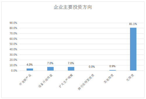 根據(jù)調(diào)查問卷顯示,有81.1%的企業(yè)表示“無投資”,僅有18.9%的企業(yè)在設(shè)備升級(jí)改造、 擴(kuò)大生產(chǎn)規(guī)模、開發(fā)新產(chǎn)品等其他領(lǐng)域有投資活動(dòng)。投資意愿與企業(yè)資金情況有重要關(guān)系,調(diào)查顯示,有4.7%的企業(yè)認(rèn)為資金緊張為企業(yè)當(dāng)前面臨的突出問題,而資金緊張的主要原因?yàn)樨浛罨鼗\慢、存貨資金占有較多、工資等剛性支出較多,分別占38.5%、26.9%和11.5%。