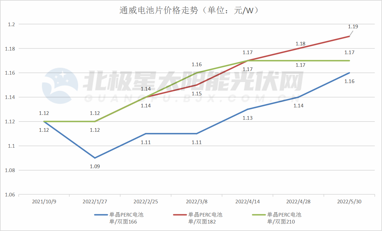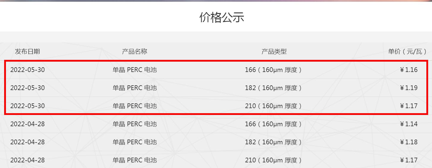 5月30日,通威太陽能發(fā)布單晶 PERC 電池片最新報價,其中,M6電池片價格上調0.02元/W至1.16元/W,M10電池片價格上調0.01元/W至1.19元/W,G12電池片價格維穩(wěn),保持1.17元/W未變。
