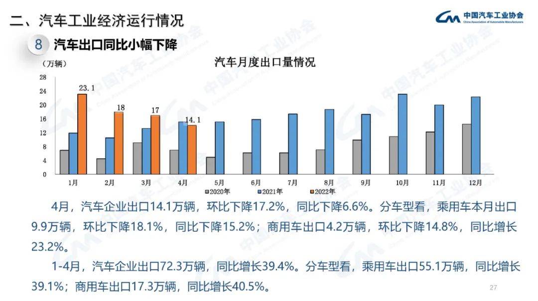 2022年4月汽車(chē)產(chǎn)銷(xiāo)呈現(xiàn)明顯下降。當(dāng)月產(chǎn)銷(xiāo)量在120萬(wàn)輛左右,為近十年以來(lái)同期月度新低;乘用車(chē)和商用車(chē)環(huán)比和同比均呈現(xiàn)大幅下降。相比較而言,新能源汽車(chē)雖也受到疫情影響,但依然高于上年同期水平,總體表現(xiàn)較好。另外,本月出口比上年同期略有回落。