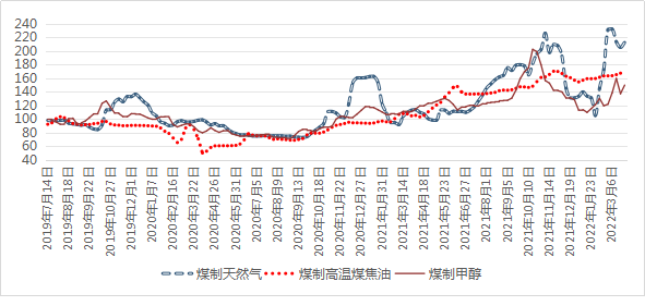 圖1我區(qū)煤制天然氣、煤制高溫煤焦油、煤制甲醇價(jià)格指數(shù)走勢(shì)圖
