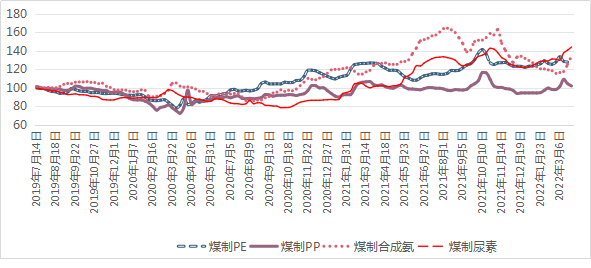 具體來(lái)看,截至3月27日,我區(qū)煤制天然氣、煤制高溫煤焦油、煤制PE、煤制PP、煤制甲醇、煤制合成氨、煤制尿素價(jià)格指數(shù)分別收于212.68點(diǎn)、168.52點(diǎn)、127.81點(diǎn)、101.93點(diǎn)、149.83點(diǎn)、134.37點(diǎn)、144.12點(diǎn),與年初(1月2日)相比,漲幅較大的是煤制天然氣、煤制甲醇,分別上漲59.45%、32.57%;漲幅較小的是煤制尿素、煤制高溫煤焦油、煤制PP、煤制PE、煤制合成氨,分別上漲17.30%、9.00%、7.99%、4.66%、3.75%。