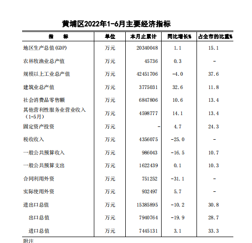 (廣州市)黃埔區(qū)2022年上半年主要經(jīng)濟指標