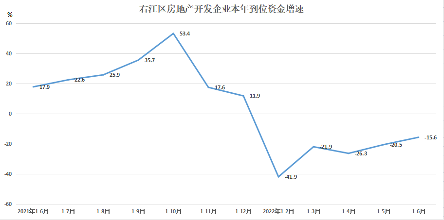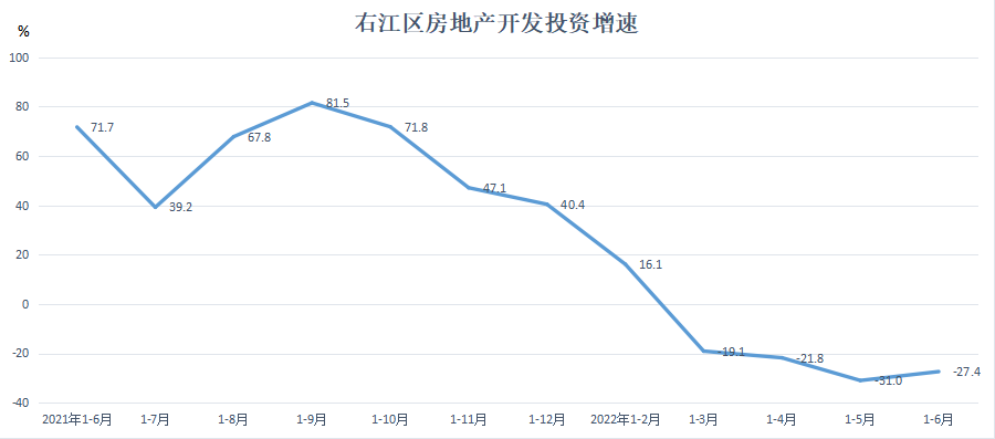 1-6月,右江區(qū)房地產(chǎn)開(kāi)發(fā)投資22.24億元,同比下降27.4%。其中,住宅投資19.35億元,同比下降29.3%。
