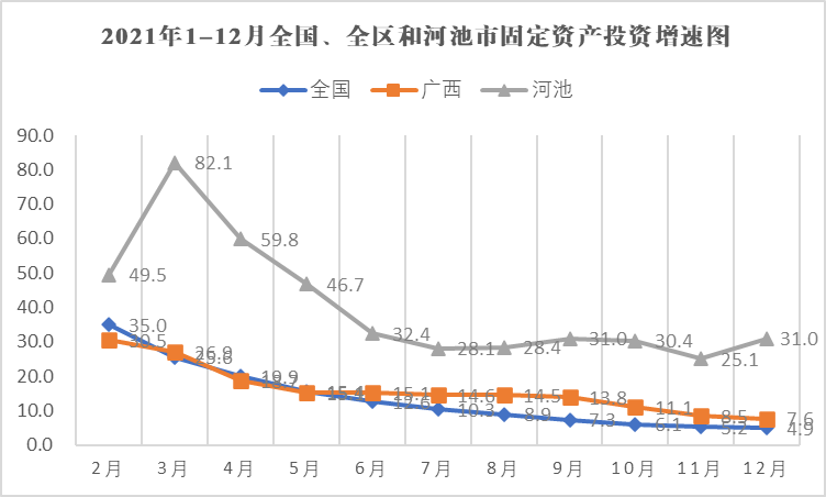 2021年,河池市固定資產(chǎn)投資同比增長(zhǎng)31.0%,比上年提高17.2個(gè)百分點(diǎn),比年初2月份回落18.5個(gè)百分點(diǎn)。增速排全區(qū)第1位,分別高于全國(guó)和全區(qū)26.1和23.4個(gè)百分點(diǎn),今年以來(lái)保持大幅高于全國(guó)和全區(qū)的增速,連續(xù)11個(gè)月保持在全區(qū)前三位,其中排第1位累計(jì)6次、排第2位累計(jì)4次、排第3位累計(jì)1次。