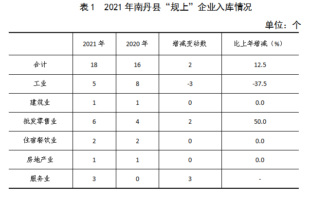 (一)入庫情況。2021年,全縣新增入庫企業(yè)18家,比上年同期增加2家,增長12.5%。分行業(yè)看,六大行業(yè)增長呈“二升一降三持平”態(tài)勢。其中,服務(wù)業(yè)新增入庫3家,比上年增加3家,呈完全增長態(tài)勢;批發(fā)零售業(yè)入庫6家,比上年增加2家,增長50%;工業(yè)入庫5家,比上年減少3家,降幅為37.5%;建筑業(yè)入庫1家,住宿餐飲業(yè)入庫2家,房地產(chǎn)業(yè)入庫1家,這三大行業(yè)均與上年持平。(詳見表1)
