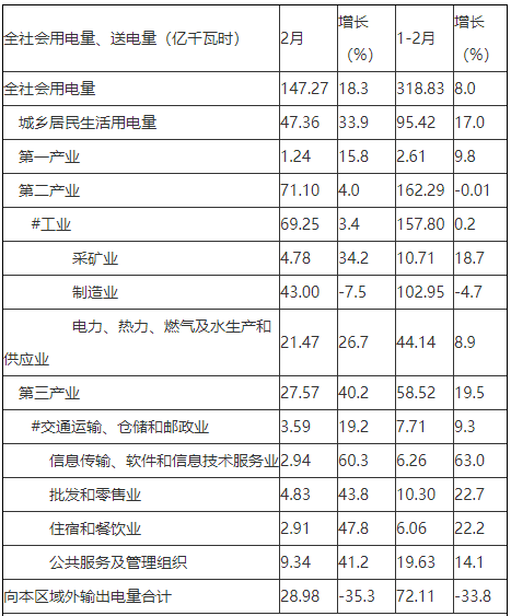 2月貴州省全社會用電量147.27億千瓦時,同比增長18.3%。1-2月貴州全社會用電量318.83億千瓦時,同比增長8.0%。