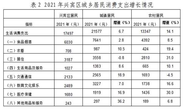 2021年,興賓區(qū)居民人均消費(fèi)支出17497元,同比增長10.0%。分城鄉(xiāng)看,城鎮(zhèn)居民人均消費(fèi)支出21577元,同比增長6.7%;農(nóng)村居民人均消費(fèi)支出13347元,同比增長14.1%。