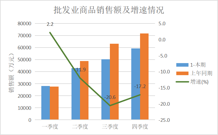 (二)批發(fā)業(yè)低位運(yùn)行。2021年全縣批發(fā)業(yè)完成銷售額5.94億元,比上年下降17.2%,遠(yuǎn)低于全市平均增速36.1個(gè)百分點(diǎn),排全市第6位,兩年平均增速下降15.3%。批發(fā)業(yè)除一季度小幅增長外,其余三季度均為負(fù)增長,其中降幅最大的為三季度,累計(jì)增速下降20.6%。主要原因:一是2021年限額以上批發(fā)業(yè)停業(yè)企業(yè)較多,且無新入庫企業(yè),在上年基數(shù)較大的情況下,限上批發(fā)業(yè)銷售額增速出現(xiàn)負(fù)增長;二是龍頭企業(yè)拉動力不足,限上企業(yè)中,銷售額占比最高的龍頭企業(yè)增速下降52.1%。