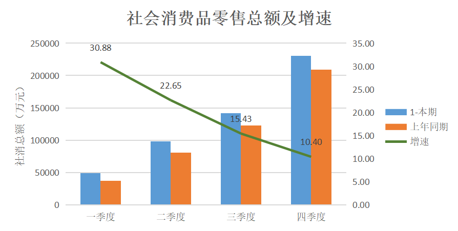 (一)社會消費(fèi)品零售總額保持平穩(wěn)增長。2021年,全縣社會消費(fèi)品零售總額完成23.06億元,比上年增長10.4%,低于全市平均增速0.6個(gè)百分點(diǎn),排全市第3位,兩年平均增長3.7%。從總體上看,一至四季度,低基數(shù)效應(yīng)逐漸減弱,社會消費(fèi)品零售總額增速逐步放緩,但仍保持兩位數(shù)增長,消費(fèi)品市場整體呈現(xiàn)逐步回暖復(fù)蘇態(tài)勢。