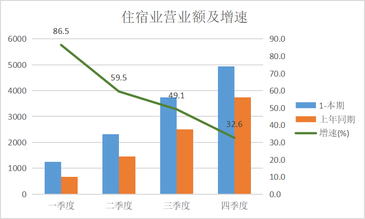 (四)住宿業(yè)增速回落明顯,但仍保持較快增長。2021年全縣住宿業(yè)完成營業(yè)額0.49億元,比上年增長32.6%,高于全市平均增速12.6個(gè)百分點(diǎn),排全市第2位,兩年平均增長10.3%。受低基數(shù)效應(yīng)影響逐步減弱,增速逐季回落,但在疫情防控常態(tài)化下,居民外出旅游、商務(wù)出行按需釋放,住宿業(yè)實(shí)現(xiàn)恢復(fù)性較快增長。