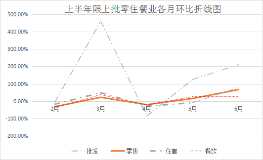 (一)行業(yè)波動較大。上半年限上批零住餐業(yè)環(huán)比波動較大,主要原因是相關(guān)激勵政策持續(xù)性不足。