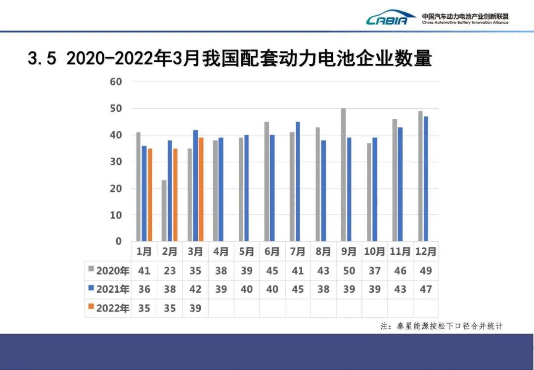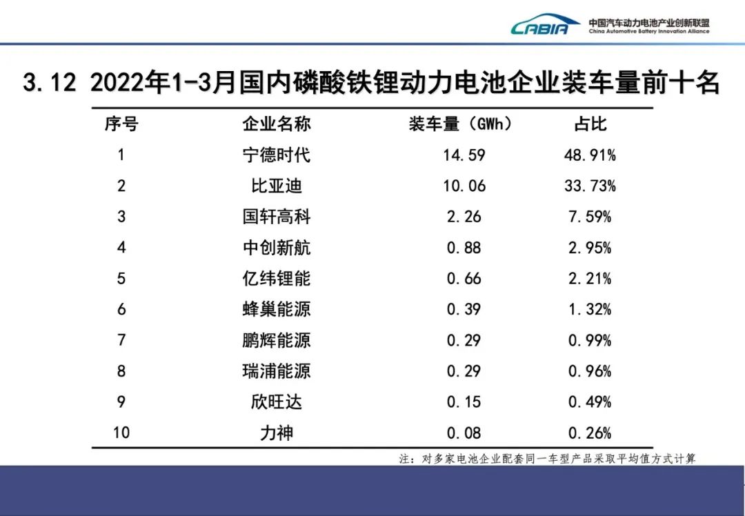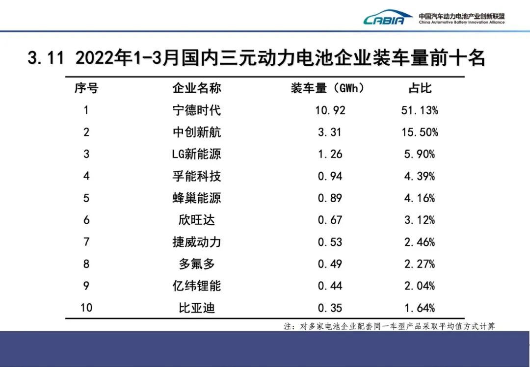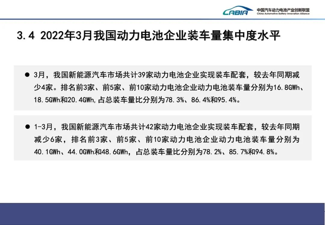 2022年3月,我國新能源汽車市場共計39家動力電池企業(yè)實現(xiàn)裝車配套,較去年同期減少4家。排名前3家、前5家、前10家動力電池企業(yè)動力電池裝車量分別為16.8GWh、18.5GWh和20.4GWh,占總裝車量比分別為78.3%、86.4%和95.4%。2022年1-3月,我國新能源汽車市場共計42家動力電池企業(yè)實現(xiàn)裝車配套,較去年同期減少6家,排名前3家、前5家、前10家動力電池企業(yè)動力電池裝車量分別為40.1GWh、44.0GWh和48.6GWh,占總裝車量比分別為78.2%、85.7%和94.8%。