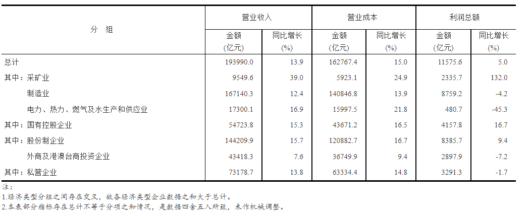 二、規(guī)模以上工業(yè)企業(yè)利潤總額、營業(yè)收入等指標(biāo)的增速均按可比口徑計(jì)算。報(bào)告期數(shù)據(jù)與上年所公布的同指標(biāo)數(shù)據(jù)之間有不可比因素,不能直接相比計(jì)算增速。其主要原因是:(一)根據(jù)統(tǒng)計(jì)制度,每年定期對規(guī)模以上工業(yè)企業(yè)調(diào)查范圍進(jìn)行調(diào)整。每年有部分企業(yè)達(dá)到規(guī)模標(biāo)準(zhǔn)納入調(diào)查范圍,也有部分企業(yè)因規(guī)模變小而退出調(diào)查范圍,還有新建投產(chǎn)企業(yè)、破產(chǎn)、注(吊)銷企業(yè)等變化。(二)加強(qiáng)統(tǒng)計(jì)執(zhí)法,對統(tǒng)計(jì)執(zhí)法檢查中發(fā)現(xiàn)的不符合規(guī)模以上工業(yè)統(tǒng)計(jì)要求的企業(yè)進(jìn)行了清理,對相關(guān)基數(shù)依規(guī)進(jìn)行了修正。(三)加強(qiáng)數(shù)據(jù)質(zhì)量管理,剔除跨地區(qū)、跨行業(yè)重復(fù)統(tǒng)計(jì)數(shù)據(jù)。