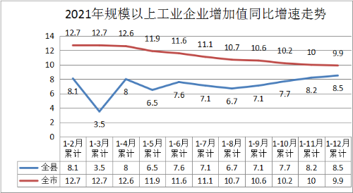12月全縣“規(guī)上”工業(yè)增加值增速為10.8%,居全市第1位,較全市平均水平高2.9個(gè)百分點(diǎn),連續(xù)3月高于全市平均水平。2021年全縣“規(guī)上”工業(yè)增加值增長8.5%,居全市第5位,低于全市(9.9%) 1.4個(gè)百分點(diǎn),與全市的差距較一季度的9.2個(gè)百分點(diǎn)大幅縮小。