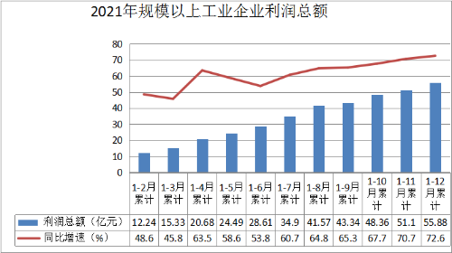 2021年全縣“規(guī)上”工業(yè)實(shí)現(xiàn)利潤總額55.88億元,同比增長72.6%,增速較一季度、二季度、三季度分別提升26.8個(gè)百分點(diǎn)、18.8個(gè)百分點(diǎn)、7.3個(gè)百分點(diǎn),增速逐季提升。