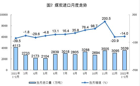原煤生產(chǎn)較快增長,進(jìn)口降幅收窄。1—2月份,生產(chǎn)原煤6.9億噸,同比增長10.3%,增速比上年12月份加快3.1個百分點(diǎn),日均產(chǎn)量1164萬噸。進(jìn)口煤炭3539萬噸,同比下降14.0%,降幅比上年12月份收窄6.9個百分點(diǎn)。