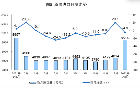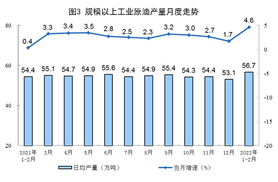 原油生產(chǎn)穩(wěn)定增長,進(jìn)口由增轉(zhuǎn)降。1—2月份,生產(chǎn)原油3347萬噸,同比增長4.6%,增速比上年12月份加快2.9個百分點(diǎn),日均產(chǎn)量56.7萬噸。進(jìn)口原油8514萬噸,同比下降4.9%,上年12月份為增長20.1%。