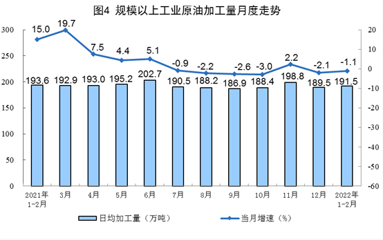 原油加工量略有下降。1—2月份,加工原油11301萬噸,同比下降1.1%,降幅比上年12月份收窄1.0個百分點(diǎn),日均加工191.5萬噸。