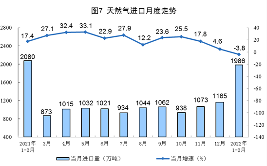 天然氣生產(chǎn)保持增長,進(jìn)口下降。1—2月份,生產(chǎn)天然氣372億立方米,同比增長6.7%,增速比上年12月份加快4.4個百分點(diǎn),日均產(chǎn)量6.3億立方米。進(jìn)口天然氣1986萬噸,同比下降3.8%,上年12月份為增長4.6%。