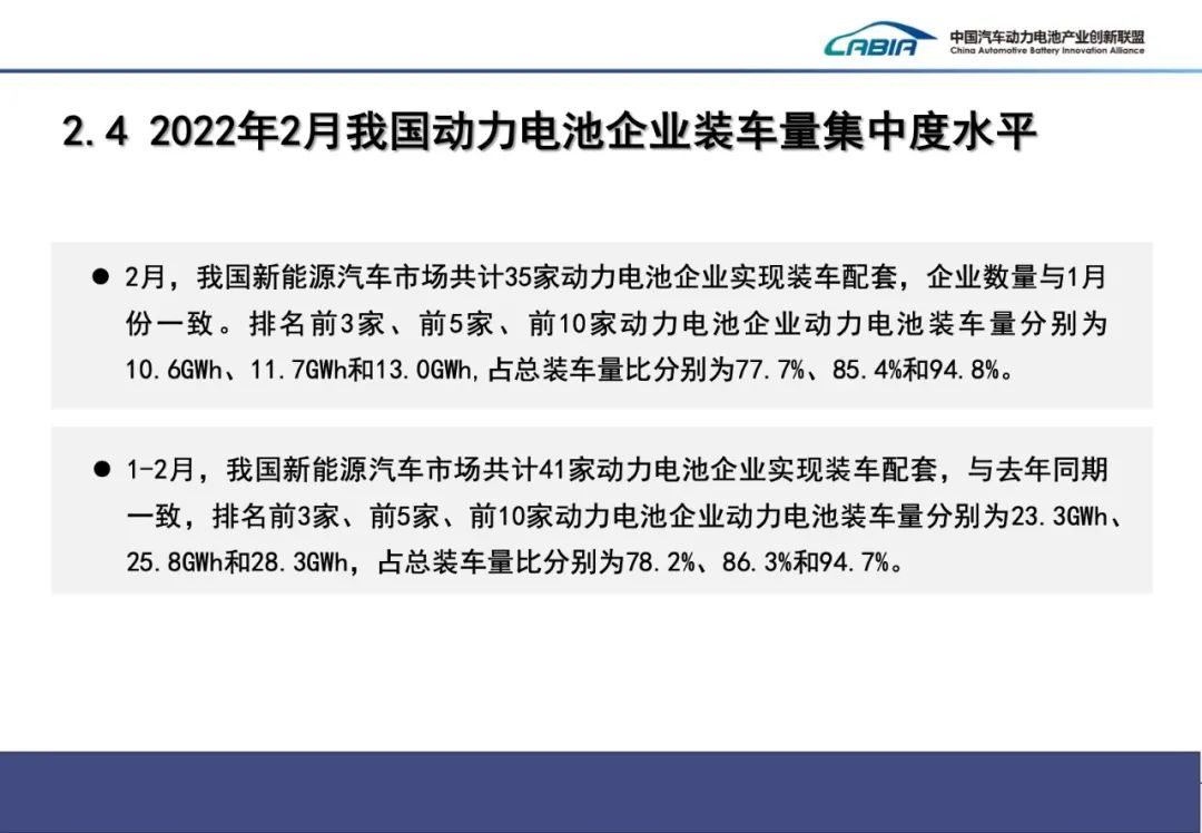 2022年2月,我國(guó)新能源汽車(chē)市場(chǎng)共計(jì)35家動(dòng)力電池企業(yè)實(shí)現(xiàn)裝車(chē)配套,企業(yè)數(shù)量與1月份一致。排名前3家、前5家、前10家動(dòng)力電池企業(yè)動(dòng)力電池裝車(chē)量分別為10.6GWh、11.7GWh和13.0GWh,占總裝車(chē)量比分別為77.7%、85.4%和94.8%。1-2月,我國(guó)新能源汽車(chē)市場(chǎng)共計(jì)41家動(dòng)力電池企業(yè)實(shí)現(xiàn)裝車(chē)配套,與去年同期一致,排名前3家、前5家、前10家動(dòng)力電池企業(yè)動(dòng)力電池裝車(chē)量分別為23.3GWh、25.8GWh和28.3GWh,占總裝車(chē)量比分別為78.2%、86.3%和94.7%。