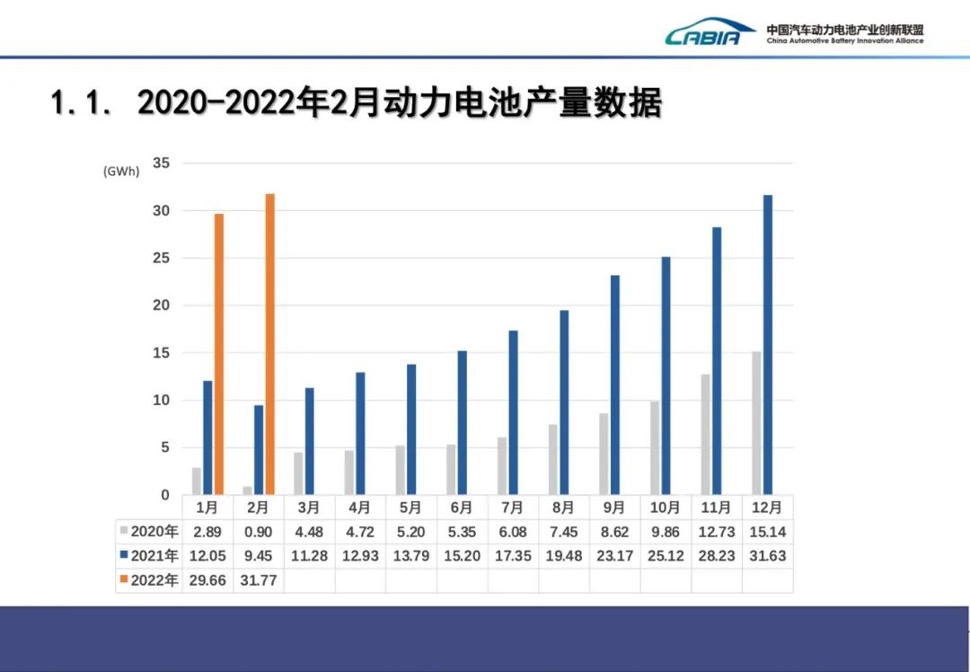2022年|2022年2月動(dòng)力電池產(chǎn)量31.8GWh 磷酸鐵鋰20.1GWh 同比增長(zhǎng)364.1%