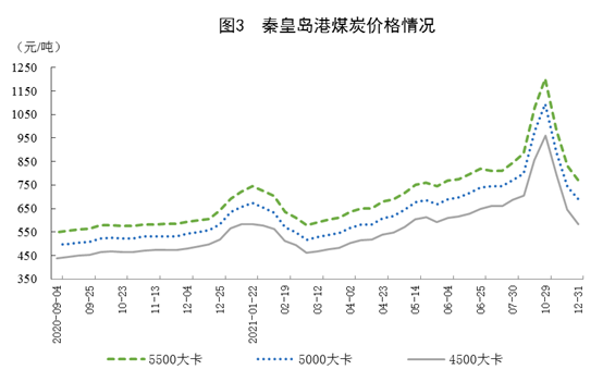 煤炭?jī)r(jià)格回落。12月31日,秦皇島港5500大卡、5000大卡和4500大卡動(dòng)力煤綜合交易價(jià)格分別為每噸773元、692元和584元,比11月26日分別回落213元、199元和208元。