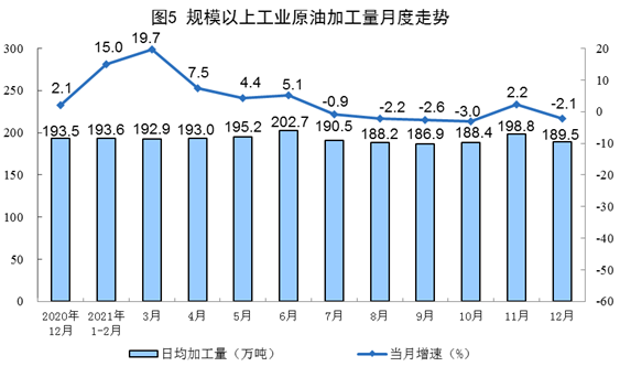 原油生產(chǎn)增速略有回落,加工量由增轉(zhuǎn)降。12月份,生產(chǎn)原油1647萬噸,同比增長(zhǎng)1.7%,增速比上月放緩1.0個(gè)百分點(diǎn),比2019年同期增長(zhǎng)2.6%,兩年平均增長(zhǎng)1.3%,日均產(chǎn)量53.1萬噸;加工原油5873萬噸,同比下降2.1%,上月為增長(zhǎng)2.2%,比2019年同期下降0.1%,兩年平均下降0.1%,日均加工189.5萬噸。