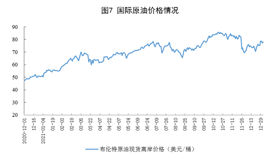 原油進(jìn)口由降轉(zhuǎn)增,國(guó)際原油價(jià)格上漲。12月份,進(jìn)口原油4614萬噸,同比增長(zhǎng)19.9%,上月為下降8.0%;2021年,進(jìn)口原油51298萬噸,比上年下降5.4%。12月31日,布倫特原油現(xiàn)貨離岸價(jià)格為77.24美元/桶,比11月30日的70.86美元/桶上漲9.0%。