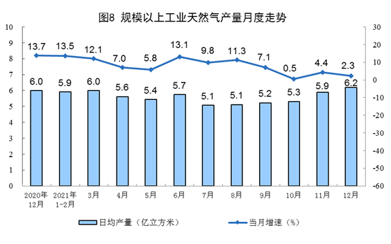天然氣生產(chǎn)放緩。12月份,生產(chǎn)天然氣192億立方米,同比增長(zhǎng)2.3%,增速比上月放緩2.1個(gè)百分點(diǎn),比2019年同期增長(zhǎng)16.4%,兩年平均增長(zhǎng)7.9%,日均產(chǎn)量6.2億立方米。