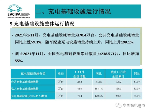 5.充電基礎(chǔ)設(shè)施整體運行情況,2021年1-11月,充電基礎(chǔ)設(shè)施增量為70.4萬臺,公共充電基礎(chǔ)設(shè)施增量同比上漲59.1%,隨車配建充電設(shè)施增量持續(xù)上升,同比上升198.1%。截止2021年11月,全國充電基礎(chǔ)設(shè)施累計數(shù)量為238.5萬臺,同比增加55%。
