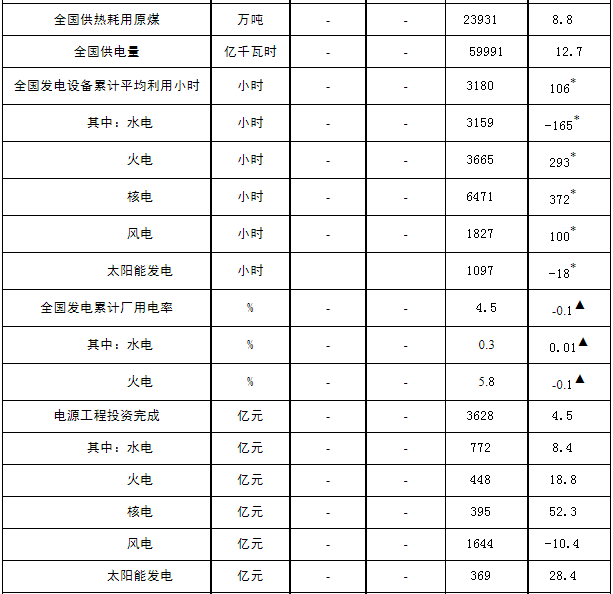 注:1.全社會用電量為全口徑數(shù)據(jù),全國供電量為調(diào)度口徑數(shù)據(jù)。2.“同比增長”列中,標(biāo)*的指標(biāo)為絕對量;標(biāo)▲的指標(biāo)為百分點。