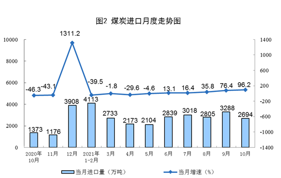 原煤生產(chǎn)由降轉(zhuǎn)升。隨著增產(chǎn)保供政策措施落地見效,優(yōu)質(zhì)產(chǎn)能加快釋放,10月份,生產(chǎn)原煤3.6億噸,同比增長(zhǎng)4.0%,上月為下降0.9%,比2019年同期增長(zhǎng)5.5%,兩年平均增長(zhǎng)2.7%,日均產(chǎn)量1152萬噸。進(jìn)口煤炭2694萬噸,同比增長(zhǎng)96.2%。