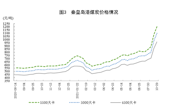 10月29日,秦皇島港5500大卡、5000大卡、4500大卡動(dòng)力煤綜合交易價(jià)格分別為每噸1202元、1096元和961元,比9月24日分別上漲123元、116元和104元。從中國(guó)沿海電煤采購(gòu)價(jià)格(綜合價(jià))看,11月4日至11月11日當(dāng)周,5500大卡為每噸1095元,比10月份明顯回落。