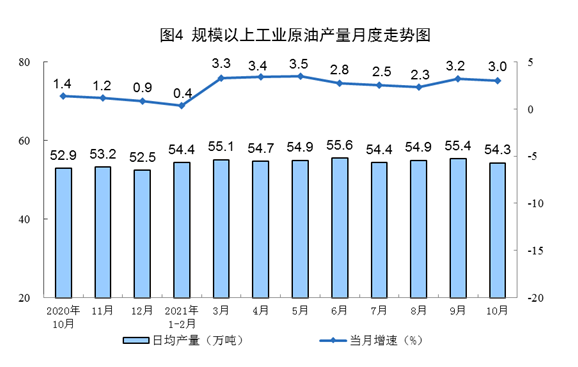 原油生產(chǎn)基本平穩(wěn),加工量降幅略有擴(kuò)大。10月份,生產(chǎn)原油1683萬噸,同比增長(zhǎng)3.0%,增速比上月放緩0.2個(gè)百分點(diǎn),比2019年同期增長(zhǎng)4.5%,兩年平均增長(zhǎng)2.2%,日均產(chǎn)量54.3萬噸;加工原油5840萬噸,同比下降3.0%,降幅比上月擴(kuò)大0.4個(gè)百分點(diǎn),比2019年同期下降0.5%,兩年平均下降0.2%,日均加工188.4萬噸。