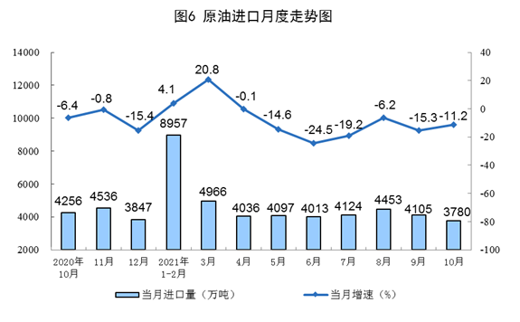 1—10月份,生產(chǎn)原油16619萬噸,同比增長(zhǎng)2.5%,比2019年同期增長(zhǎng)4.2%,兩年平均增長(zhǎng)2.1%;加工原油58515萬噸,同比增長(zhǎng)5.2%,比2019年同期增長(zhǎng)8.3%,兩年平均增長(zhǎng)4.1%。