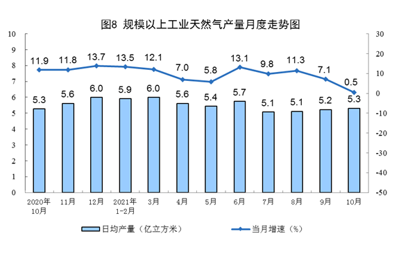 天然氣生產(chǎn)增速回落。10月份,生產(chǎn)天然氣165億立方米,同比增長(zhǎng)0.5%,增速比上月回落6.6個(gè)百分點(diǎn),比2019年同期增長(zhǎng)12.4%,兩年平均增長(zhǎng)6.0%,日均產(chǎn)量5.3億立方米。