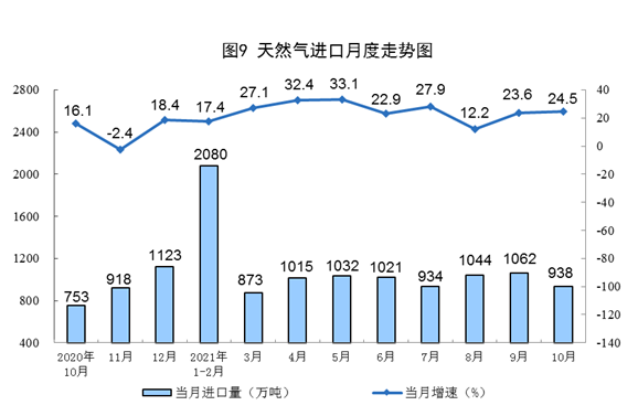 天然氣進(jìn)口快速增長(zhǎng)。10月份,進(jìn)口天然氣938萬噸,同比增長(zhǎng)24.5%,增速比上月加快0.9個(gè)百分點(diǎn)。1—10月份,進(jìn)口天然氣9907萬噸,同比增長(zhǎng)22.3%。