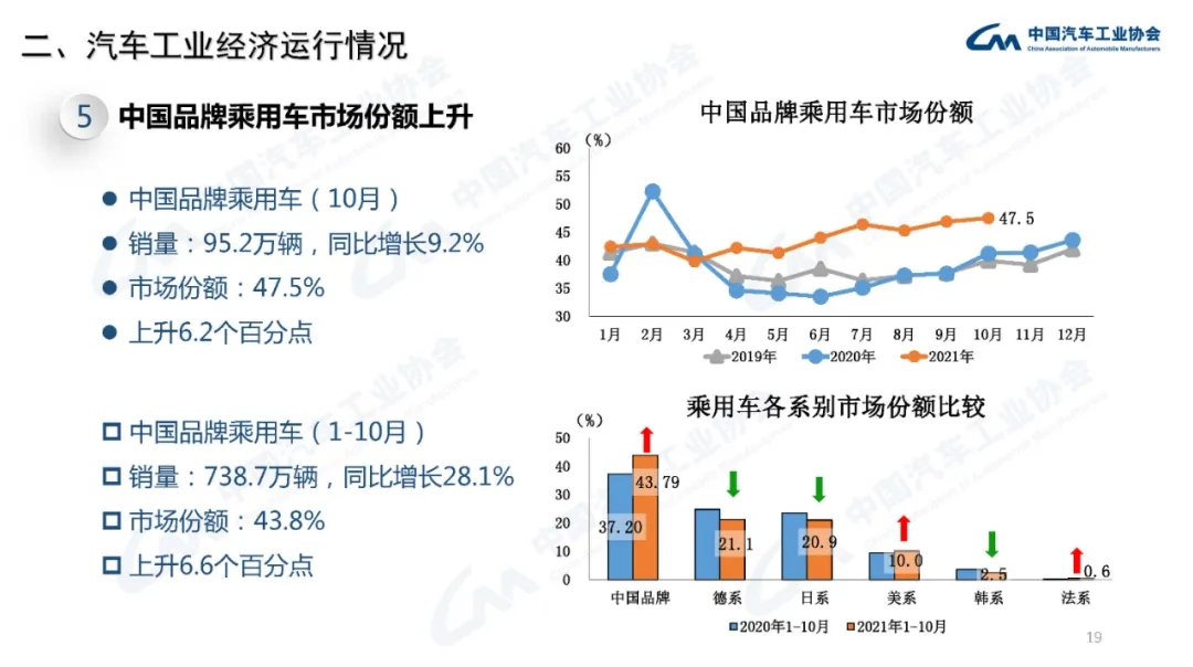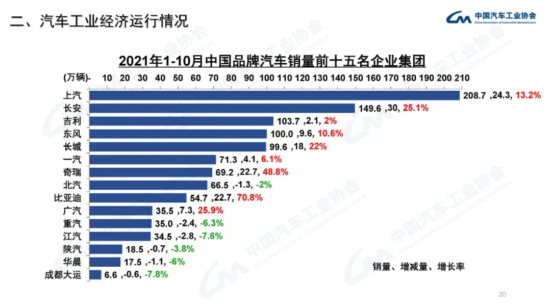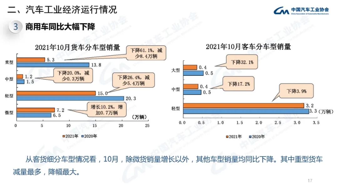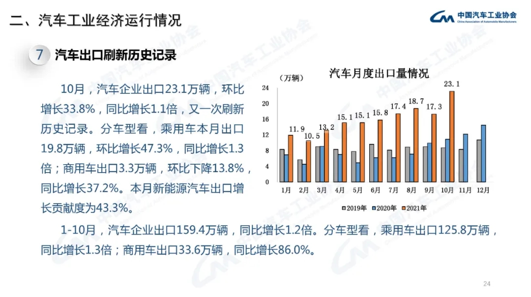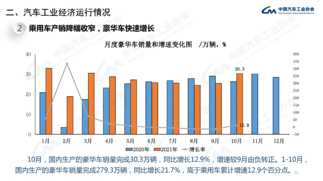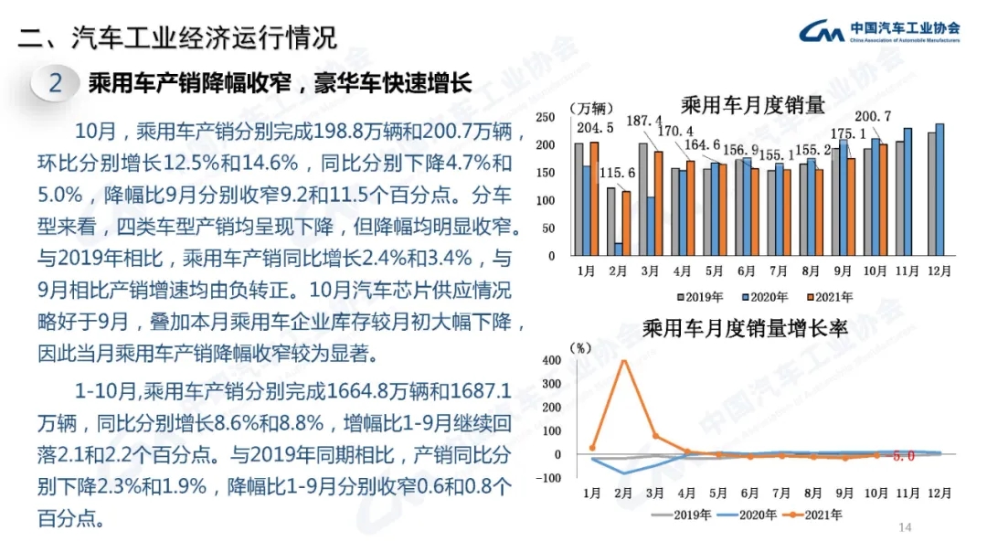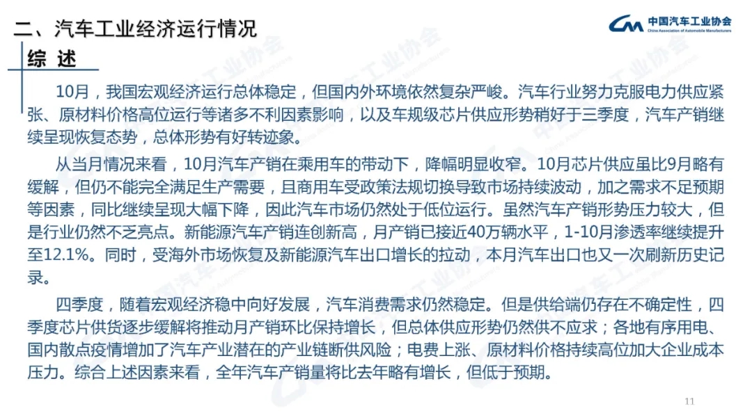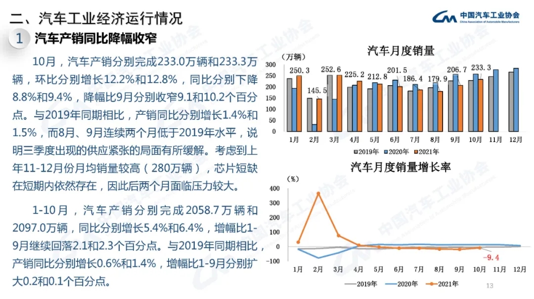 據(jù)中國(guó)汽車工業(yè)協(xié)會(huì)統(tǒng)計(jì)分析,2021年10月,我國(guó)宏觀經(jīng)濟(jì)運(yùn)行總體穩(wěn)定,但國(guó)內(nèi)外環(huán)境依然復(fù)雜嚴(yán)峻。汽車行業(yè)努力克服電力供應(yīng)緊張、原材料價(jià)格高位運(yùn)行等諸多不利因素影響,以及車規(guī)級(jí)芯片供應(yīng)形勢(shì)稍好于三季度,汽車產(chǎn)銷繼續(xù)呈現(xiàn)恢復(fù)態(tài)勢(shì),總體形勢(shì)有好轉(zhuǎn)跡象。