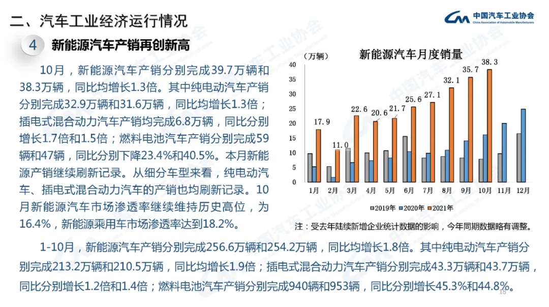 獲悉,2021年10月新能源汽車生產(chǎn)39.7萬輛,同比增長(zhǎng)133.2%;銷售達(dá)38.2萬輛,同比增長(zhǎng)達(dá)134.9%。