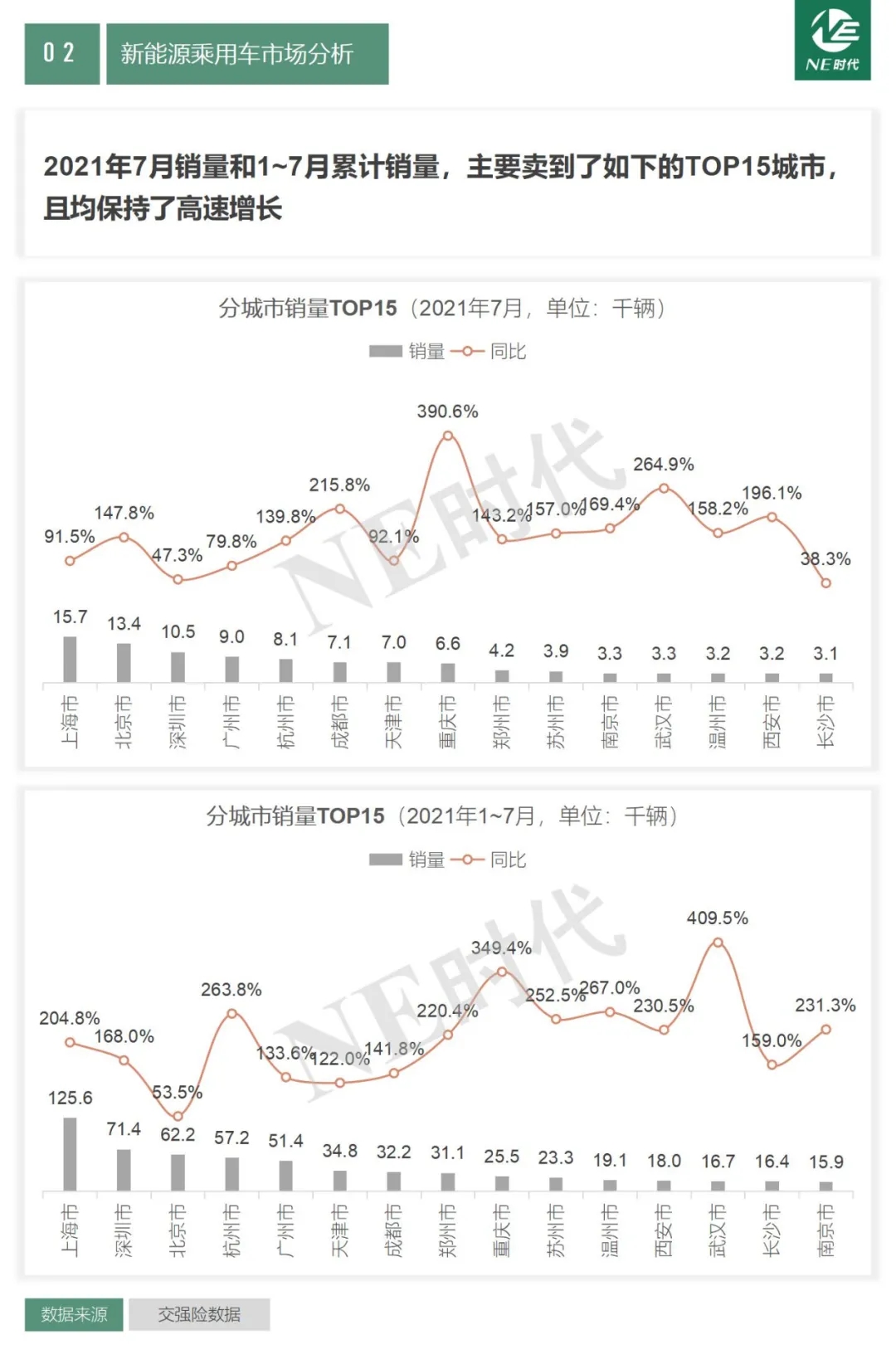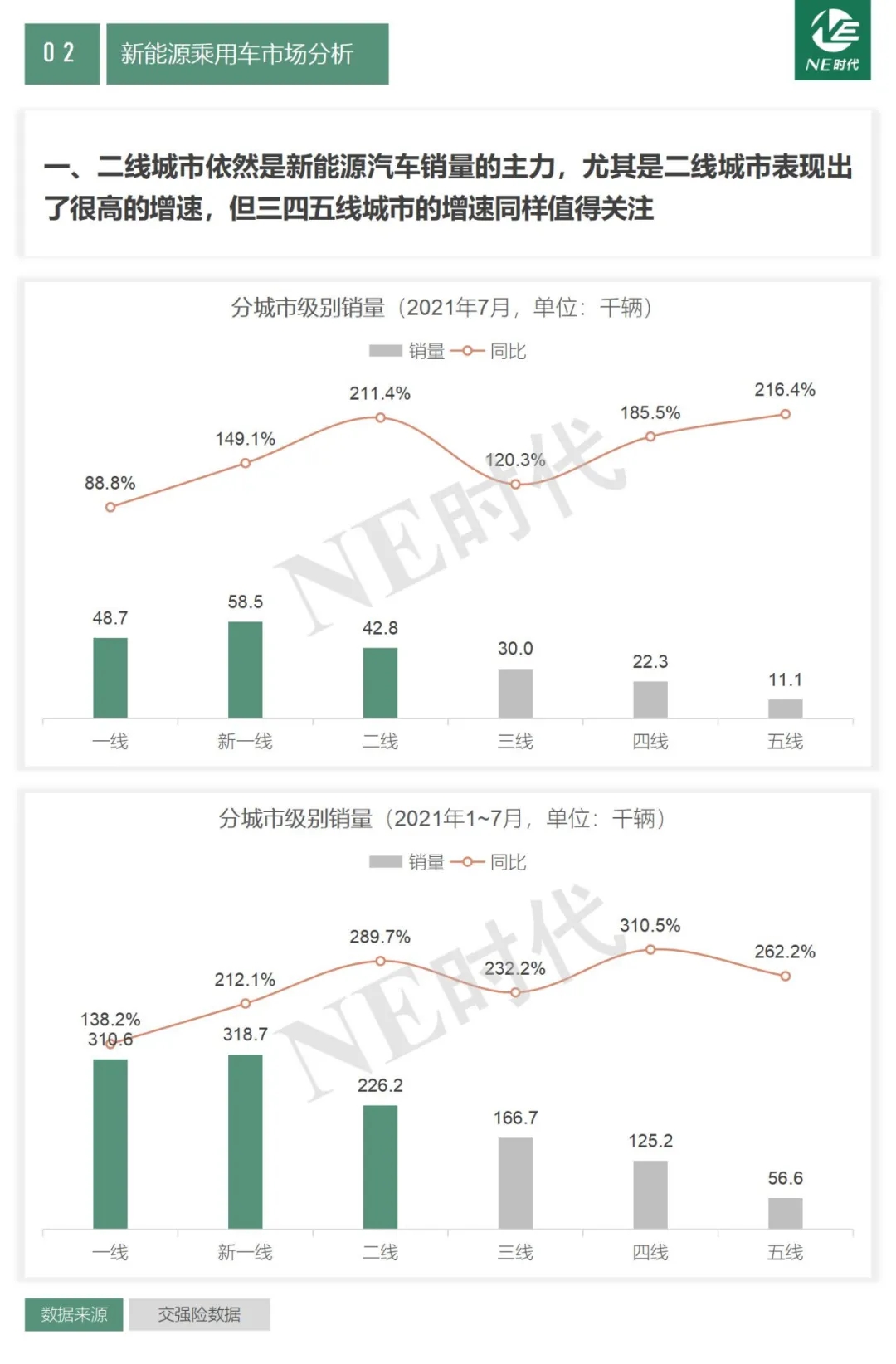 2021年7月銷量和1-7月累計銷量,主要賣到了如下的TOP15城市,且均保持了高速增長。一、二線城市依然是新能源汽車銷量的主力,尤其是二線城市表現(xiàn)出了很高的增速,但三四五線城市的增速同樣值得關注。