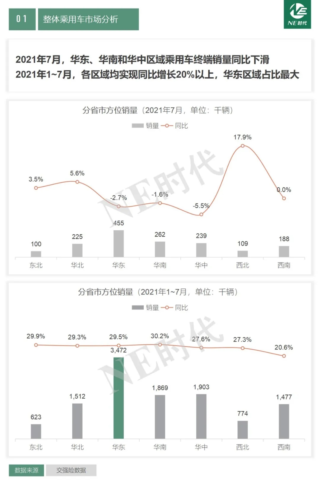 2021年7月,華東、華南和華中區(qū)域乘用車終端銷量同比下滑;2021年1-7月,各區(qū)域均實現(xiàn)同比增長20%以上,華東區(qū)域占比最大。