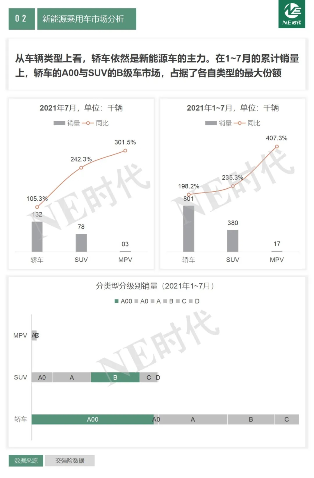 2021年7月,新能源乘用車繼續(xù)保持高速增長態(tài)勢;2021年1-7月,累計銷量已超過2020全年,市場擴張迅速。從車輛類型上看,轎車依然是新能源車的主力。在1~7月的累計銷量上,轎車的A00與SUV的B級車市場,占據(jù)了各自類型的最大份額。